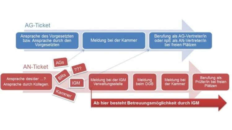 Nach Eingang Deiner Prüfermeldung, klärt Deine Geschäftsstelle mit Deinem Betrieb(srat) die Möglichkeit, Dich als Prüfer:in zu benennen. Liegen keine Einwände vor, meldet sie Dich über den DGB bei Deiner zuständigen Stelle, welche Dich schlussendlich als Prüfer:in für fünf Jahre beruft, wenn ein freier Ausschussplatz vorhanden ist.
