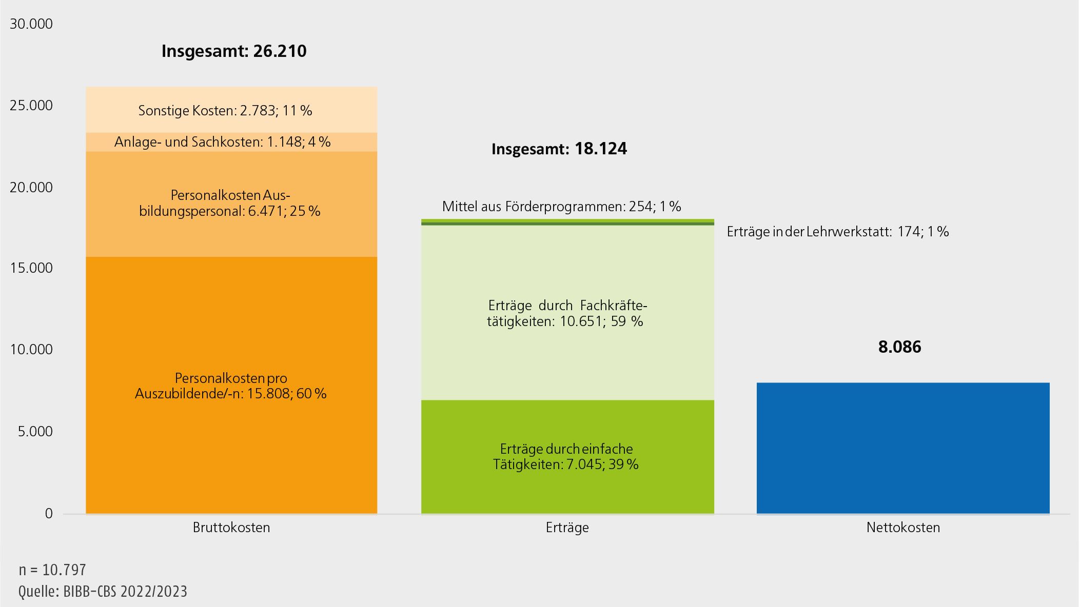 Im Ausbildungsjahr 2022/2023 lagen die durchschnittlichen Bruttokosten pro Auszubildendem bei rund 26.200 Euro. Diese umfassen unter anderem Personalkosten, Sachmittel, Kammergebühren und Ausgaben für Lehrmaterialien. Gleichzeitig erbrachten die Auszubildenden produktive Leistungen im Wert von etwa 18.100 Euro. Das entspricht rund 70 Prozent der Ausbildungskosten. In jedem vierten Fall überstiegen die Erträge sogar die Bruttokosten, was zu einem positiven Nettoergebnis führte.